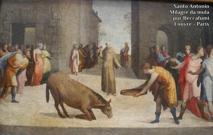 Em Toulouse, por exemplo, um cátaro* que persistia em negar a presença real de Cristo na Eucaristia propôs-lhe um desafio: durante três dias deixaria uma mula sem qualquer alimento, e a levaria depois para a praça pública, onde Frei Antônio lhe apresentaria a custódia com o Santíssimo Sacramento, enquanto o herege lhe ofereceria um monte de feno.