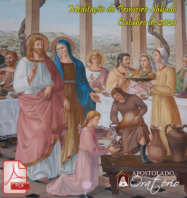 Nossa devoção do Primeiro Sábado contemplará em outubro o 2º Mistério Luminoso do Rosário — O milagre das Bodas de Caná — tendo em vista a Festa de Nossa Senhora Rosário, celebrada neste mês de outubro. Ao faltar o vinho na festa de casamento em Caná, Maria interveio em favor dos noivos e, pelos rogos d’Ela, Jesus realizou seu primeiro milagre público. Era o início da incansável intercessão com que nossa Mãe e Rainha clementíssima protege seus filhos e devotos ao longo dos tempos.