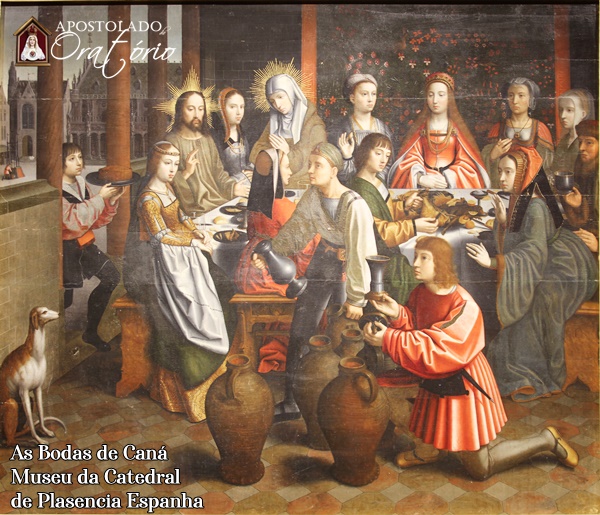 Façamos nossa composição de lugar imaginando um salão na época de Jesus, onde se realiza uma festa de casamento. Vemos uma grande mesa à qual os convivas estão sentados, tendo ao centro o novo casal, todos manifestando seu contentamento pela ocasião. Em outro recinto contíguo, vemos Nossa Senhora, Nosso Senhor e alguns serviçais, junto a seis grandes talhas de pedra. Nossa Senhora gesticula carinhosamente para seu Filho, e Este A fita com ternura e respeito. Ele se volta então para os serviçais e lhes pede que encham as talhas com água. Em seguida as abençoa e delas é retirado um precioso vinho.