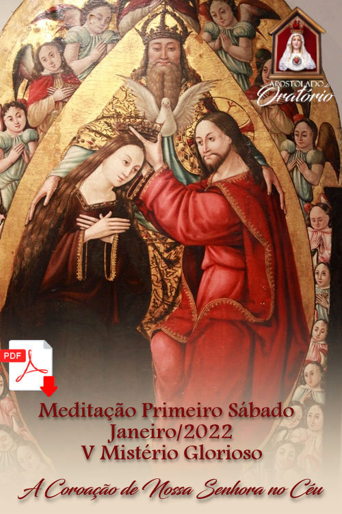 Iniciemos nossa devoção do Primeiro Sábado de 2022, meditando no 5º Mistério Glorioso: A Coroação de Nossa Senhora no Céu, tendo em vista de modo especial a Solenidade de Maria, Mãe de Deus. Levada à glória da eterna bem-aventurança em corpo e alma, a Bendita Virgem foi solenemente coroada pela Santíssima Trindade como a Soberana de todo o Universo, ocupando para sempre seu lugar ao lado do trono de Cristo Rei, seu Filho. E das alturas em que habita, Maria se volta inteiramente para cuidar de seus súditos e filhos que caminham neste mundo rumo ao Céu.