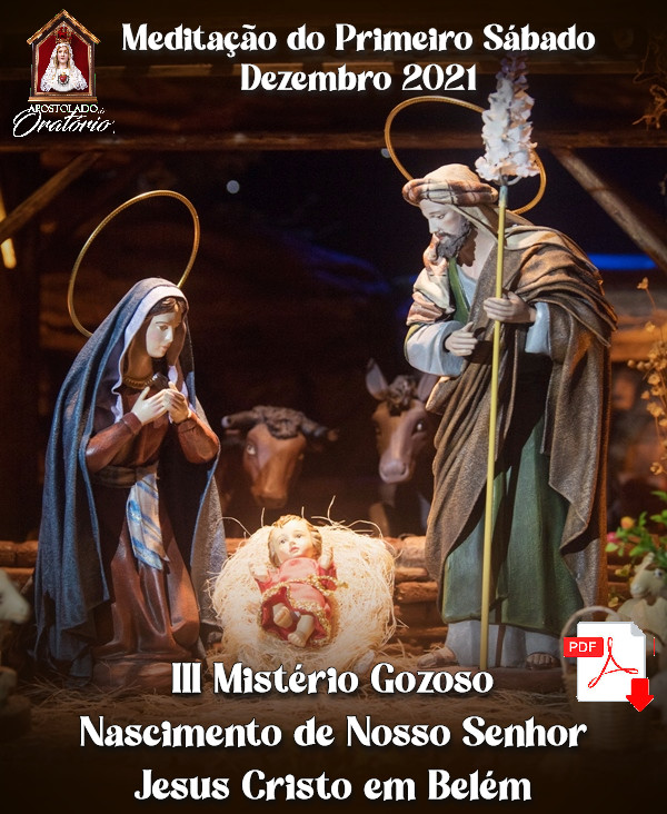Preparemos nossa Devoção do Primeiro Sábado, atendendo ao pedido de Nossa Senhora de Fátima para desagravar o seu Imaculado Coração. Na meditação do mês de dezembro vamos considerar o 3º Mistério Gozoso: O nascimento de Nosso Senhor Jesus Cristo na gruta de Belém. O Rei do Céu e da Terra vem ao mundo envolto num mistério de grandeza e de humildade, convidando-nos desde o primeiro instante a segui-Lo como o Caminho, a Verdade e a Vida.