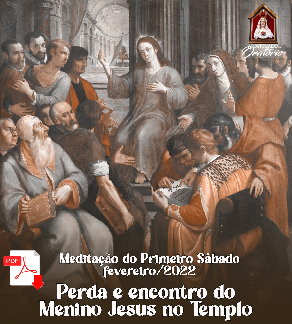 Realizaremos nossa devoção do Primeiro Sábado de fevereiro contemplando o 5º Mistério Gozoso: A perda e o encontro do Menino Jesus no Templo de Jerusalém. Da consideração deste Mistério devemos tirar duas preciosas lições, conforme nos ensina Santo Afonso de Ligório: a primeira, que devemos renunciar a tudo, até mesmo amigos e parentes se necessário for, quando o serviço e a maior glória de Deus assim o exigir de nós; e a segunda, que Deus se faz achar por aqueles que O procuram, especialmente se o fizerem através de sua Mãe, Maria Santíssima.