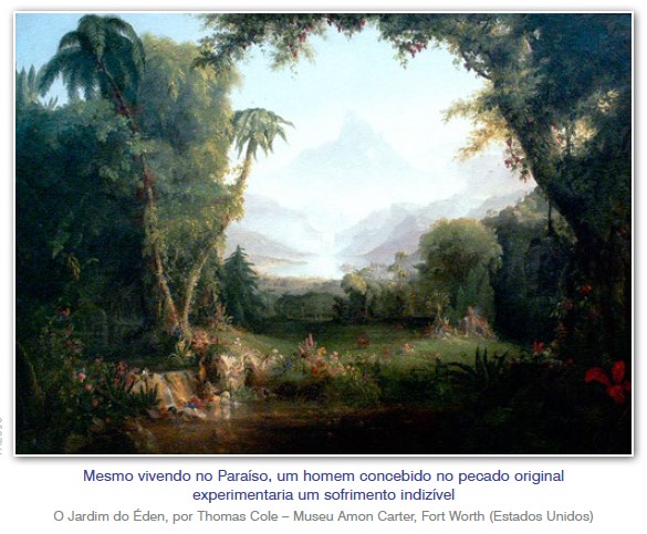 Nesta perspectiva, imaginemos que Adão e Eva não tivessem caído, e no Paraíso Terrestre se desenvolvesse uma sociedade em que as pessoas se relacionassem em harmonia, vivendo no gozo perfeito e sem experimentar padecimento algum. Suponhamos, ainda, que nesse ambiente se introduzisse um indivíduo com pecado original: ele conviveria com os outros sem a menor possibilidade de desentendimento com ninguém, sendo tratado com elegância e consideração, num bem-estar colossal por ser objeto de todo o desvelo, cuidado e carinho. No entanto, embora pareça um absurdo, este homem teria um sofrimento pavoroso… o sofrimento de não sofrer!