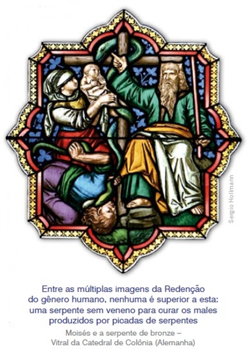 É divina a didática de Jesus. Conforme os comentaristas, entre as múltiplas imagens da Redenção do gênero humano, nenhuma é superior a esta: uma serpente sem veneno para curar os males produzidos por picadas de serpentes. Afirma São Paulo: “como pelo pecado de um só a condenação se estendeu a todos os homens, assim por um único ato de justiça recebem todos os homens a justificação que dá a vida” (Rm 5, 18); “Assim como em Adão todos morrem, assim em Cristo todos reviverão” (I Cor 15, 22).