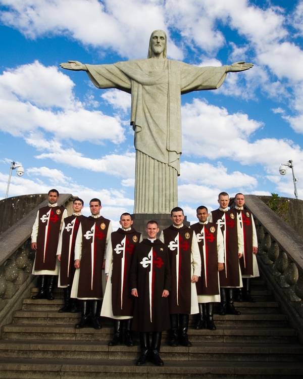 – O hábito dos Arautos do Evangelho são revestidos pelo escapulário do Carmo, marcado com a cruz de Santiago.