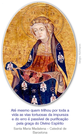 Até mesmo quem trilhou por toda a vida as vias tortuosas da impureza e do erro é passível de purificação pela graça do Divino Espírito, podendo, inclusive, chegar a tornar-se ainda mais diáfano, mais transparente e mais luzidio do que um Serafim! Se esta afirmação parecer por demais ousada, detenhamo-nos na consideração de Santa Maria Madalena. Afundada no pecado, após uma primeira conversão mal correspondida — segundo conta a tradição —, à qual sucederam quedas ainda piores que as anteriores, foi ela justificada de tal modo que hoje seu nome se encontra inserido com precedência sobre os das virgens invocadas na Ladainha de Todos os Santos. Acaso o Espírito Santo seria impotente para realizar o que quer?