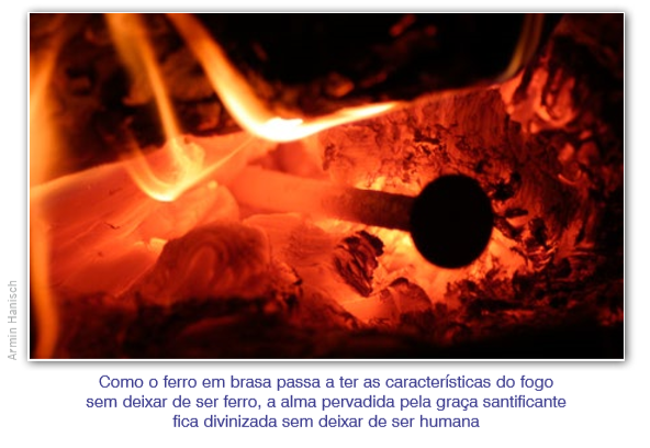 Célebre é a imagem utilizada pelos teólogos para explicar esta doutrina: o ferro quando é colocado nas altas temperaturas da forja torna-se brasa incandescente e passa a ter as características do fogo, embora continue sendo ferro. Assim é a alma pervadida pela graça santificante: sem deixar de ser humana, fica divinizada.