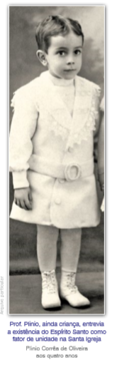 Esta presença é sentida pelas almas, ainda que de modo imponderável, como se passou com o Prof. Plinio Corrêa de Oliveira, desde menino. Refletindo sobre a unidade que transparecia na diversidade da Igreja, pensava ele: “Por cima de tudo isto há Alguém, que é mais do que tudo! É uma coisa curiosa. A Igreja não parece uma instituição, mas uma pessoa que se comunica através de mil aspectos. Ela tem movimentos, grandezas, santidades e perfeições, como se fosse uma alma imensa que se exprime em todas as igrejas católicas do mundo, todas as imagens, toda a Liturgia, todos os acordes de órgão e todos os toques de sino. Essa alma chorou com os réquiens e alegrou-se com os bimbalhares dos Sábados de Aleluia e das noites de Natal. Ela chora comigo, se alegra comigo. Como eu gosto dessa alma!”.2 Em sua jovem idade não podia ele definir tal alma naquele então, como o fez mais tarde: