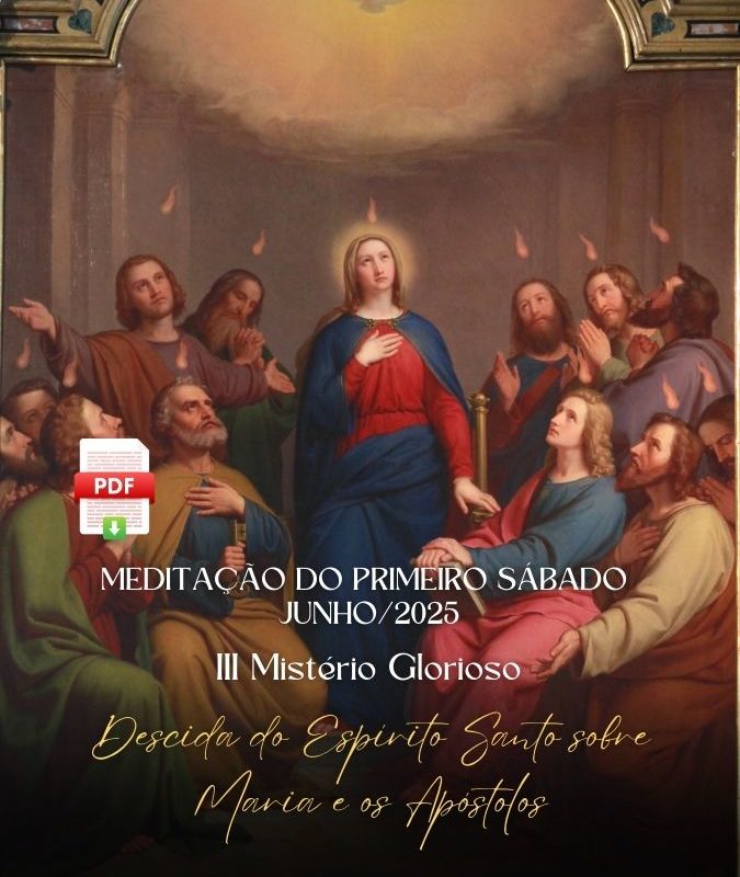 Iniciemos nossa devoção do Primeiro Sábado, meditando em junho o 3º Mistério Glorioso: A descida do Espírito Santo. Antes de partir deste mundo, Nosso Senhor Jesus Cristo fez reiteradas vezes aos seus discípulos a promessa de que, ao voltar para o Céu, pediria ao Pai que lhes enviasse um outro Consolador, o Espírito de verdade, que ficaria para sempre com eles. Nesta meditação contemplaremos a realização desta divina promessa que se estende a todos os batizados e confirmados na Fé Católica.