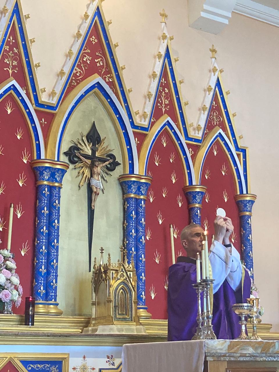 Assim, neste ambiente de tantas graças, toda a família de almas dos Arautos do Evangelho ali presente se formou na entrada da Basílica-Santuário para o cortejo que deu início à santa Missa celebrada pelo sacerdote arauto Pe. Célio Casale, EP.